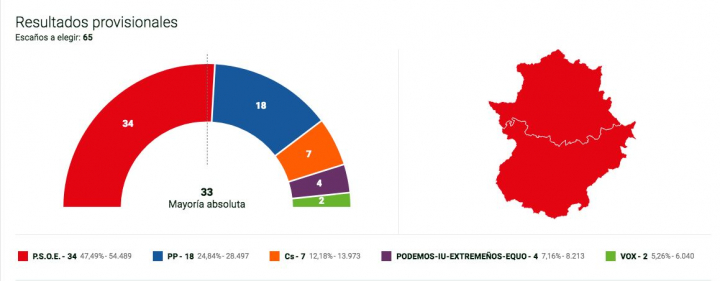 22:56 horas. Con el 21,62% escrutado, el PSOE ganaría con mayoría absoluta de 34 diputados en Extremadura.