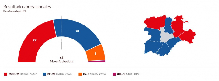 22:26 horas. El PSOE, en cabeza en Castilla y León. 29 diputados frente a los 28 del PP, con el 16% escrutado