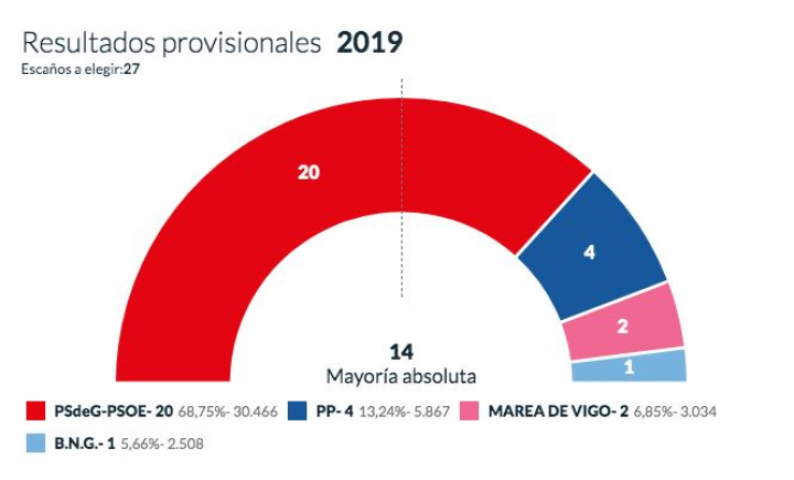 22:15 horas. Abel Caballero arrasa en Vigo con 20 concejales de 27, en torno al 30% escrutado