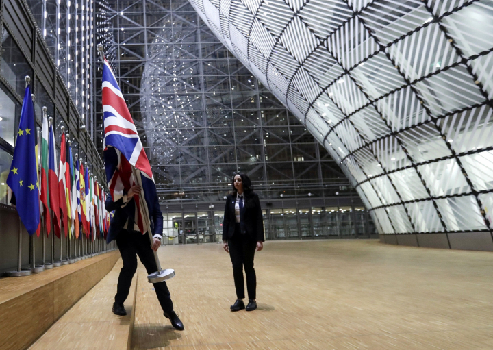 La hora se acerca y la bandera británica desaparece de las grandes instituciones de la UE. La última, el Parlamento. Antes lo había hecho el Consejo, entre otras dependencias. En su lugar se iza la enseña europea.