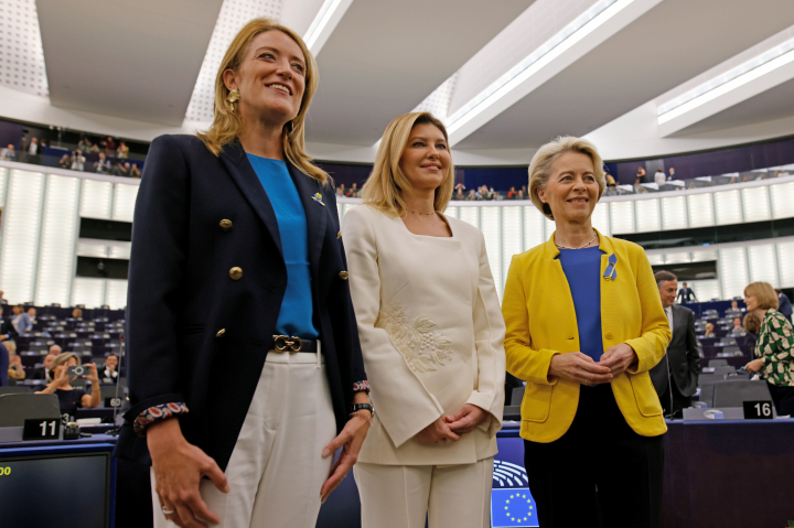 La presidenta de la Comisión Europea, Ursula von der Leyen, ha pronunciado este miércoles en el Parlamento Europeo su discurso en el debate por el estado de la Unión, una intervención teñida por los colores de Ucrania, su causa y su dolor. Desde el traje chaqueta de la alemana y sus comisarias hasta sus compromisos, pasando por la presencia, aplaudidísma, de la primera dama de Ucrania, Olena Zelenska.