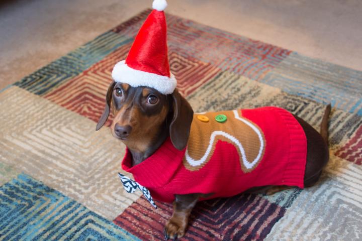 Perro salchicha vestido con gorro de Papá Noel y jersey navideño.Image by cuppyuppycake via Getty Images