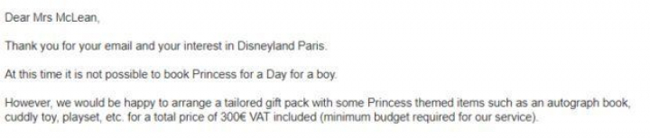 El sueño de Noah, de tres años, no pudo cumplirse. En una carta abierta y colgada en su blog, Hailey McLean Glass, una mujer inglesa de Devon (Reino Unido) de 29 años y madre de tres hijos, ha contado que el parque Disneyland Paris se negó a que su hijo participara en una actividad llamada Princesa por un Día. Así lo ha contado también Mashable France.