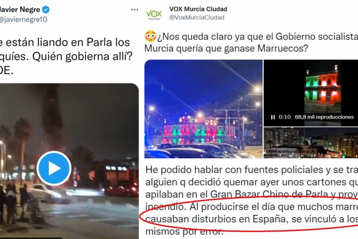 Javier Negre ha eliminado de Twitter su metedura de pata, pero ni el PP de Murcia ni Vox han querido rectificar su error público tras la derrota de la selección española de fútbol contra la marroquí en el Mundial de Qatar. Mientras que el primero acusó en un tuit a ciudadanos de origen marroquí de haber causado un gran incendio en la localidad madrileña de Parla, los segundos señalaron que el Ayuntamiento de Murcia había iluminado un edificio con los colores de dicho país al finalizar el encuentro. Ninguna de las dos informaciones era cierta.