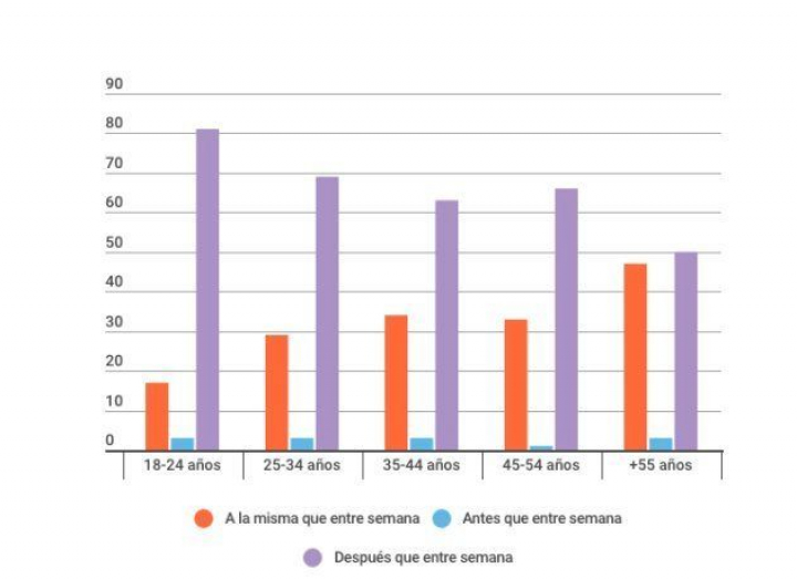 Analizar los resultados por edades tampoco da pie a grandes sorpresas: se les pegan las sábanas a los más jóvenes y se caen de la cama los más mayores. El 81% de los encuestados entre 18 y 24 años aprovechan para dormir y el 47% de los mayores de 55 se levantan a la misma hora que habitualmente. En el grupo de los jóvenes, esa respuesta sólo la ha dado un 17% de los encuestados.