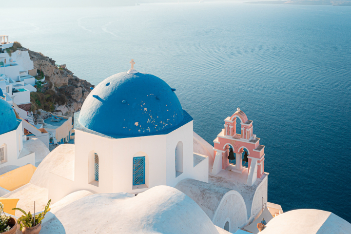 Considerado como el atardecer más bonito del mundo, las vistas de la isla desde Oia con las casas e iglesias blancas con techos y toques azules con los toques anaranjados son las más fotografiadas por los turistas. Además de la histórica Oia, también es recomendable la visita por la localidad de Fira y su puerto viejo. Otro punto para ver las preciosas vistas de la isla es el mirador de Skaros Rock en la localidad de Imerovigili o el faro de Akrotiri, aunque este último también está muy cotizado entre los turistas.