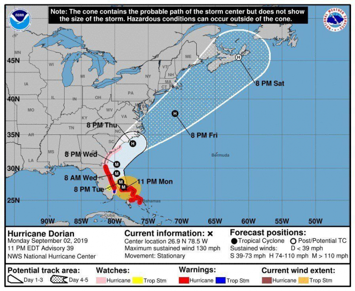 El Dorian ha mantenido la categoría 4 o 5, las más altas de la escala, desde el sábado, un periodo inusualmente largo. El NHC preveía que se mantuviera en categoría 4 toda la jornada del lunes, y que bajara a 3 al aproximarse a Florida, un huracán de categoría aún formidable, hasta reducirse a 2 a su llegada a las Carolinas. “Se prevé que el sistema siga siendo un gran huracán peligroso durante los próximos días”, advirtió el NHC.