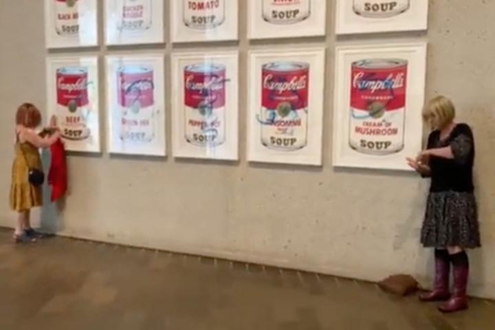 Dos activistas se pegan a las 'Latas de sopa Campbell' de Andy Warhol expuestas en Camberra