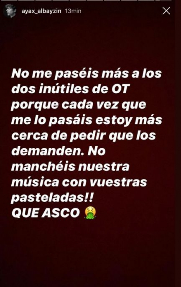Pero uno de los dos hermanos, Ayax, ha dejado en Instagram que no le ha gustado nada la nueva canción. En una historia de la red social ha colgado la siguiente frase: “No me paséis más a los dos inútiles de OT porque cada vez que me los pasáis estoy más cerca de pedir que los demanden. No manchéis nuestra música con vuestras pasteladas!! QUE ASCO”.