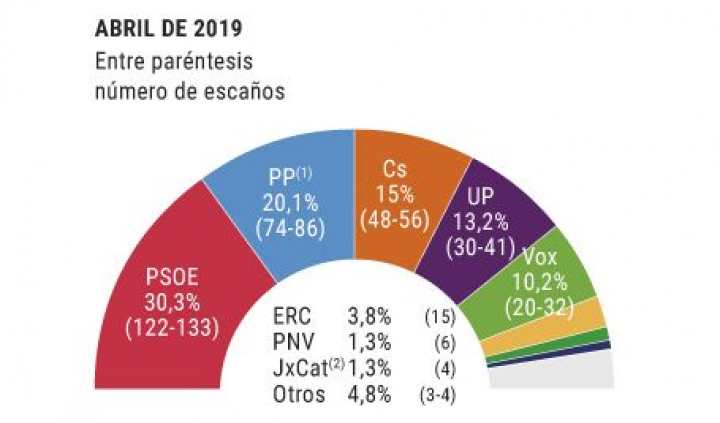 El PP sacaría 75 escaños con el 17,8% de los votos; C’s, 49, con el 14,1%; 33, Podemos, con el 13,2%; 32, Vox, con el 12,5% y otros partidos lograrían 32 escaños y el 11,2% de votos, grupo en el que se incluye ERC, al que la encuesta da 13 diputados.
