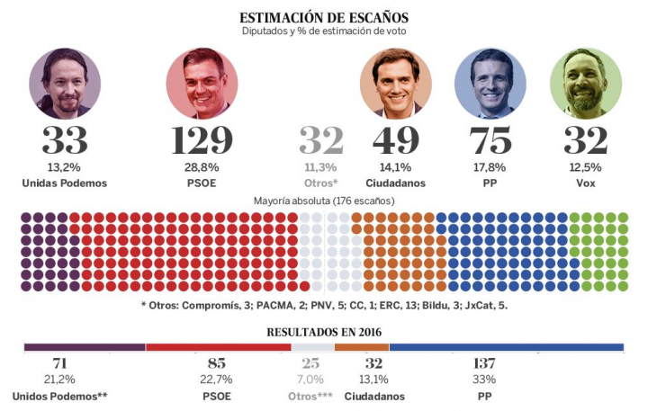 El sondeo da el 30,3% de votos al PSOE, lo que supondrían entre 122 y 133 escaños; y a Unidas Podemos, el 13,2% de votos y entre 30 y 41 parlamentarios.