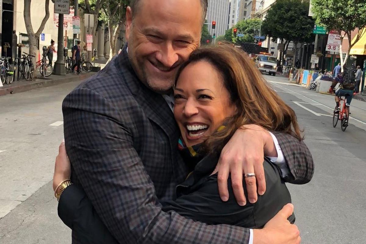 La historia es como sigue: un cineasta y productor va a su despacho a hablar de negocios, acompañado de su esposa. La mujer mira y remira a Doug y le acaba preguntando a bocajarro si está casado. Como responde que no, pregunta de nuevo: ”¿Te apetece quedar con mi amiga Kamala Harris?”. ”¿La fiscal? ¡Es guapísima!”, replicó. Así empezó todo.