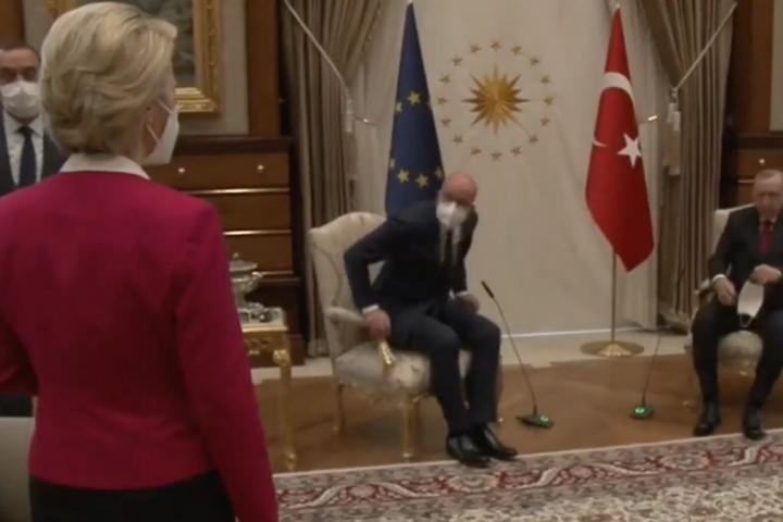 Erdogan incluso se quitó la mascarilla y Michel estiró las piernas. Von der Leyen sólo alcanzó a decir un “¿ehm?” y a gesticular con las manos para señalar que no entendía lo que estaba ocurriendo.
