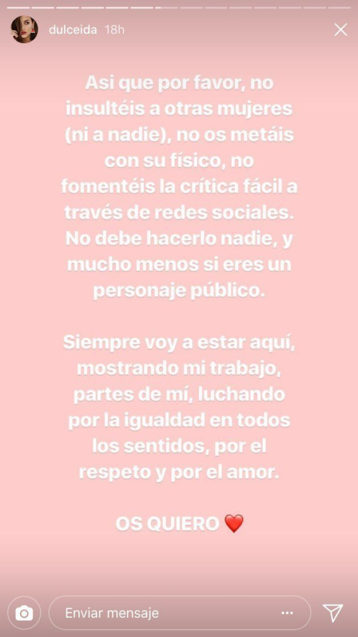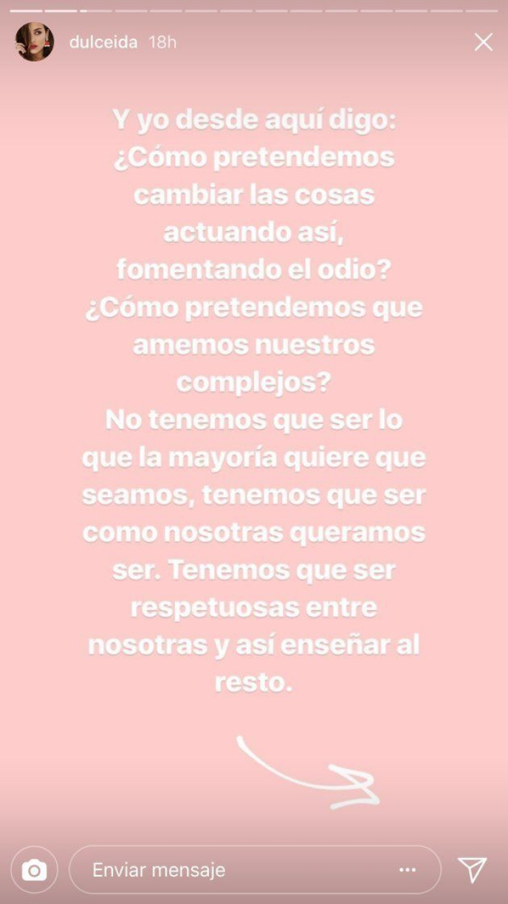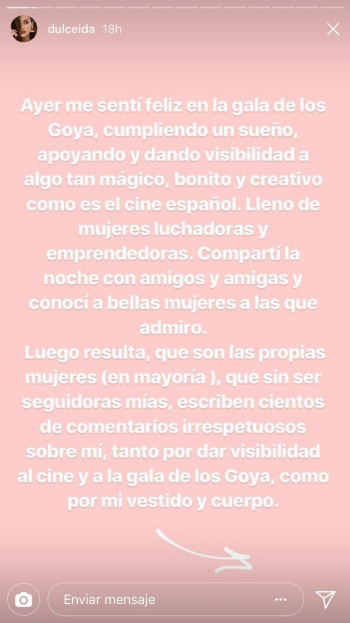 "¿Cómo pretendemos cambiar las cosas actuando así, fomentando el odio?", así ha respondido Dulceida a las críticas recibidas sobre el vestido que llevó a los Premios Goya del pasado sábado. La influencer ha publicado un stories en su cuenta de Instagram, en el que a través de una serie de imágenes lamenta haberse convertido en el centro de tantas críticas, sobre todo por parte de otras mujeres.