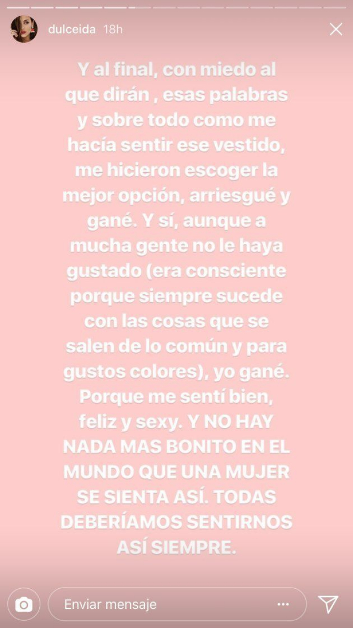 Aida Domenech también ha explicado por qué eligió ese vestido y ha defendido que no todas las mujeres deben ser iguales. "Tenemos que ser respetuosas entre nosotras y así enseñar al resto", ha escrito.
