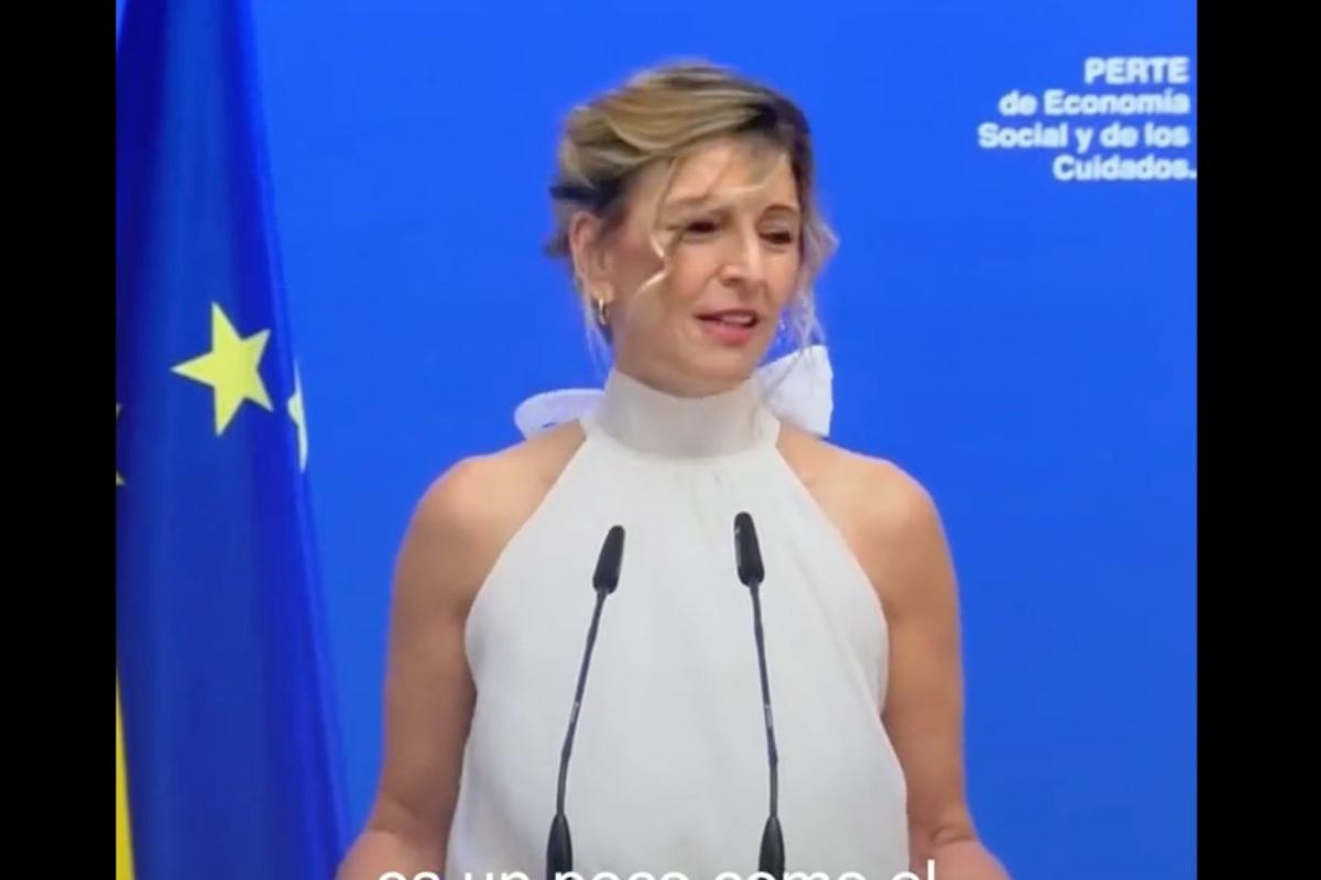 Este sábado ha vuelto a la carga tras ver un corte de unos 40 segundos que ha subido la propia vicepresidenta a su cuenta de Twitter, en el que Díaz asegura que “el Gobierno de España piensa en grande” y que “la economía social es un poco como el Gobierno de España, es un Gobierno solidario, es un Gobierno progresista, es un Gobierno feminista, es un Gobierno ambientalmente sostenible, es un Gobierno que defiende la paz, es un Gobierno que trabaja día a día para salvar a nuestro país y a nuestras gentes”.
