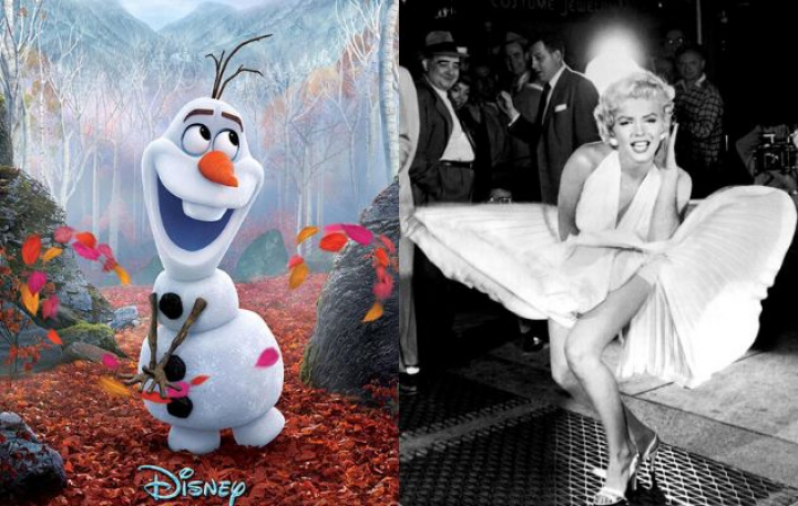 Además de los guiños a películas de animación, Frozen 2 también cuela otros a películas clásicas. La primera referencia se encuentra en uno de los carteles promocionales de la cinta, en el que se ve a Olaf rodeado de hojas como en una especie de remolino y que recuerda a la clásica imagen de Marilyn Monroe luchando contra el viento para que no le levante la falda de la película de Billy Wilder, La tentación vive arriba (1955).