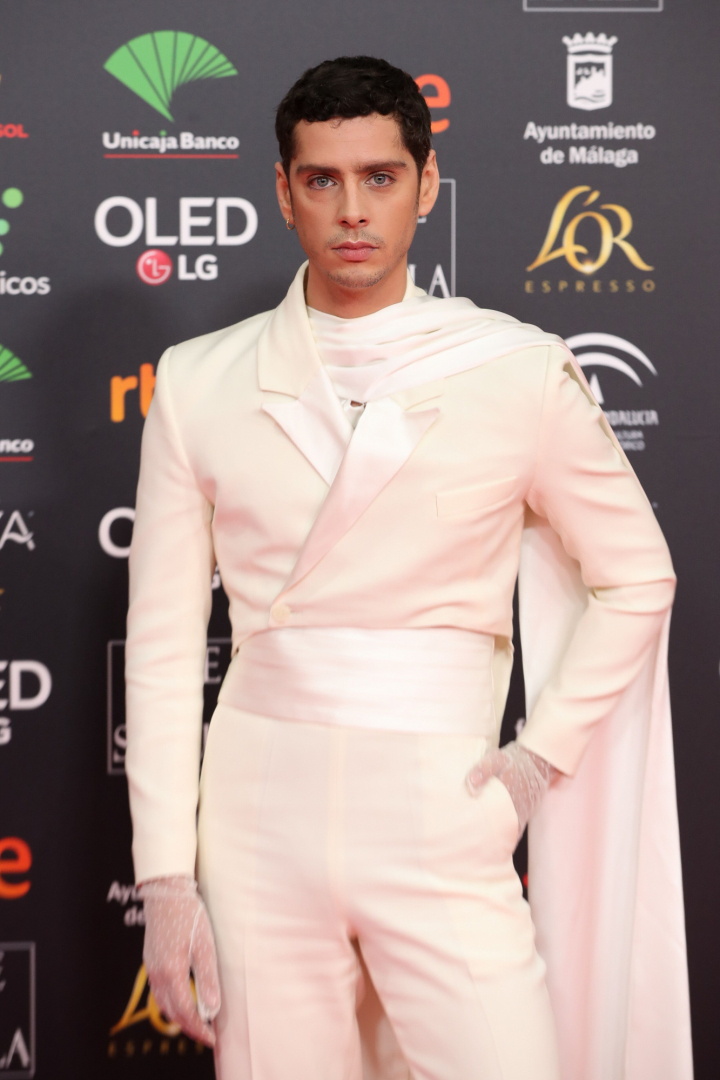 El intérprete ha aparecido vestido totalmente de blanco y vestido de la firma española Mans Concept. Casanova lleva un fajín de color blanco, guantes blancos y fular a juego.