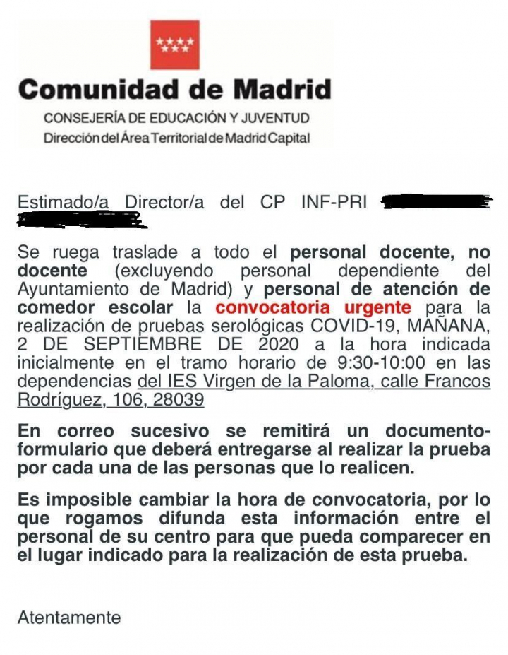 Este martes por la noche, los profesores de la comunidad y el personal no docente de los centros recibió vía email un aviso de que la Consejería les citaba para hacerse las pruebas del Covid-19, previas al inicio del curso, un test que debe desarrollarse entre este miércoles, 2 de septiembre, y el próximo lunes, 7. No va por turno libre, sino que cada uno de estos empleados estaba citado un día concreto. Algunos, hoy mismo, con apenas doce horas de diferencia entre la recepción del correo y la citación -comenzaba a las ocho-.