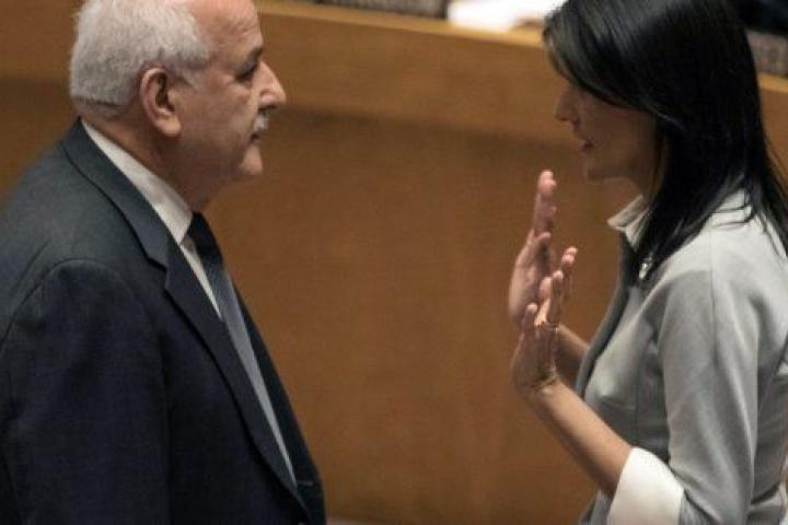 El embajador de Palestina ante las Naciones Unidas, Riyad Mansour, discute con su homóloga de EEUU, Nikki Haley, antes de la reunión del Consejo de Seguridad.EFE