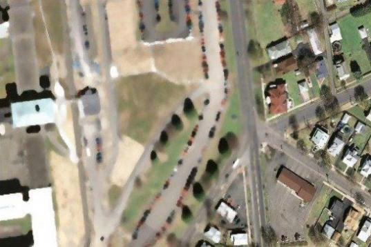 La resolución es menor que la de los edificios de los alrededores. En la vista por satélite de Bing no está disponible