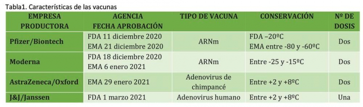Por su parte, la EMA ha autorizado las vacunas Pfizer/Biontech, Moderna y AstraZeneca/Oxford. Todas han superado ensayos clínicos abarcando decenas de miles de personas y algunas se están administrando masivamente a la población. En la tabla 1 resumimos las características más importantes de estas cuatro vacunas.