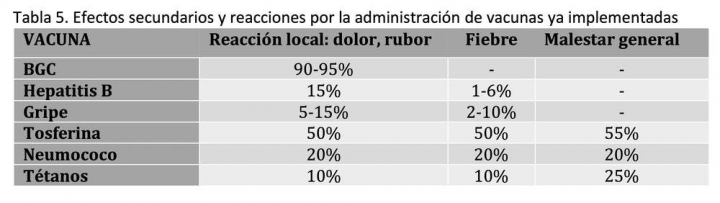 En la siguiente tabla vemos los efectos adversos más comunes de las vacunas que recibimos según el calendario de vacunación prescrito por las autoridades sanitarias. Son muy similares a los descritos anteriormente para las vacunas contra COVID-19. La diferencia es que la mayoría de ellas se nos administran cuando somos muy pequeños y no nos acordamos.