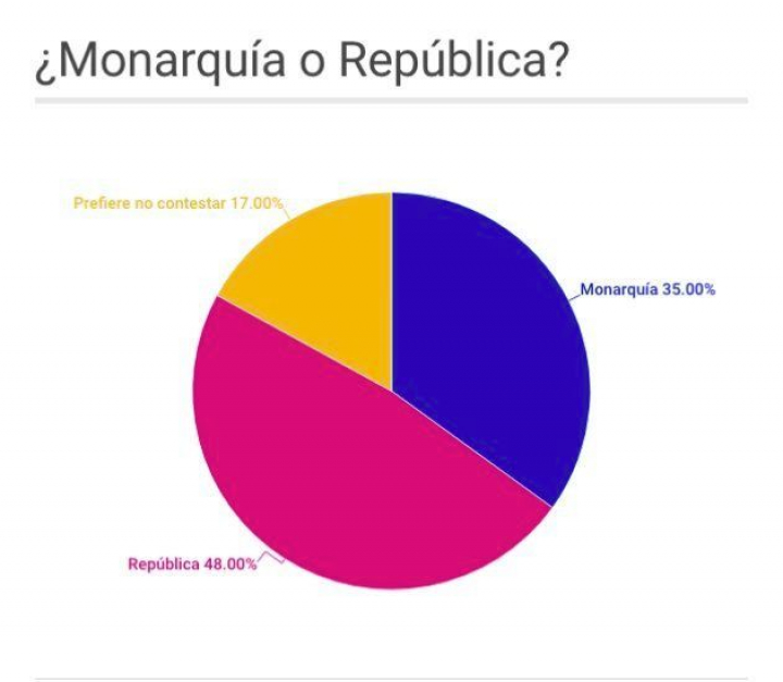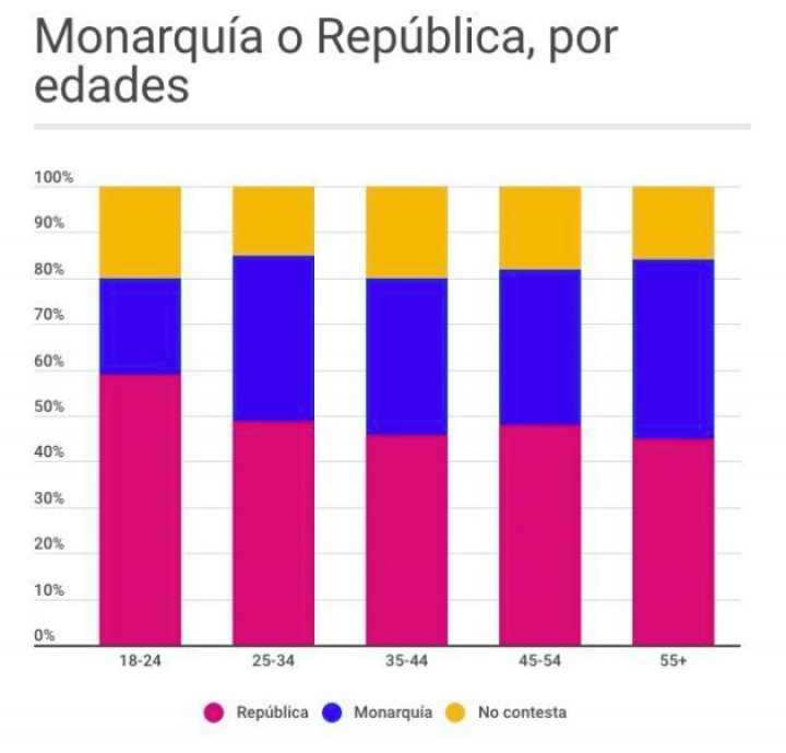 Se hizo para evitar sustos, pero la maniobra no sirve para ocultar que la monarquía cuenta con cada vez menos apoyos entre la ciudadanía. Las respuestas de los 1.002 encuestados en el sondeo, que se realizó entre el 2 y el 5 de noviembre de 2018, muestra que la institución monárquica hacen aguas especialmente entre los más jóvenes: el 59% de los preguntados de entre 18 y 24 años quiere una república Ese porcentaje supera en al menos 10 puntos el apoyo que la república registra en otras franjas de edad: 49% (25-34 años), 46% (35-44 años), 48% (45-54 años) y 45% (más de 55 años).