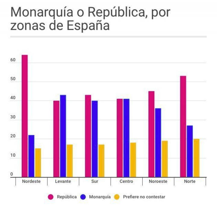 La única zona de España donde la monarquía triunfa es Levante. Allí hay un 43% de monárquicos frente al 40% de republicanos; en el sur, los porcentajes se invierten: 43% optan por república frente al 40% que opta por monarquía. En el noroeste y en el norte, hay mayoría de encuestados que se inclina por república (45 y 53%) frente a monarquía (36 y 27%, respectivamente). En el centro, tablas: 41% frente a 41%.