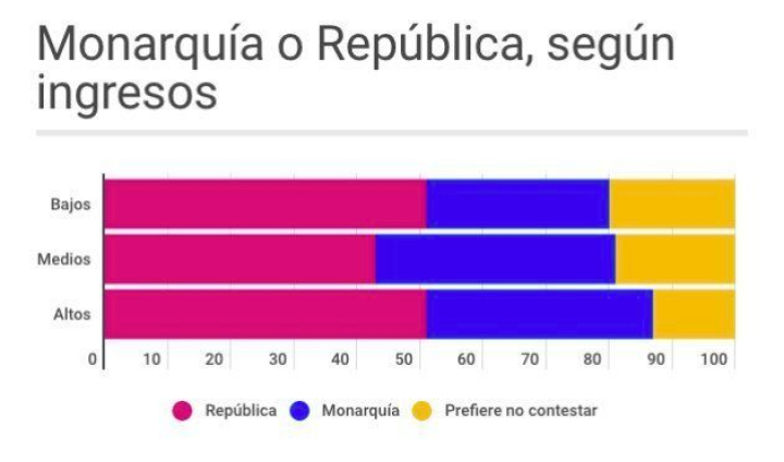 Otra variable interesante recogida en el sondeo es el de las respuestas según el nivel de ingresos. Esos datos muestran que los hogares con ingresos medios y altos son el punto de apoyo de la monarquía, que es todo caso opción minoritaria, y que la república cuenta sus apoyos más fuertes en los hogares con ingresos bajos y altos (51% y 51%).