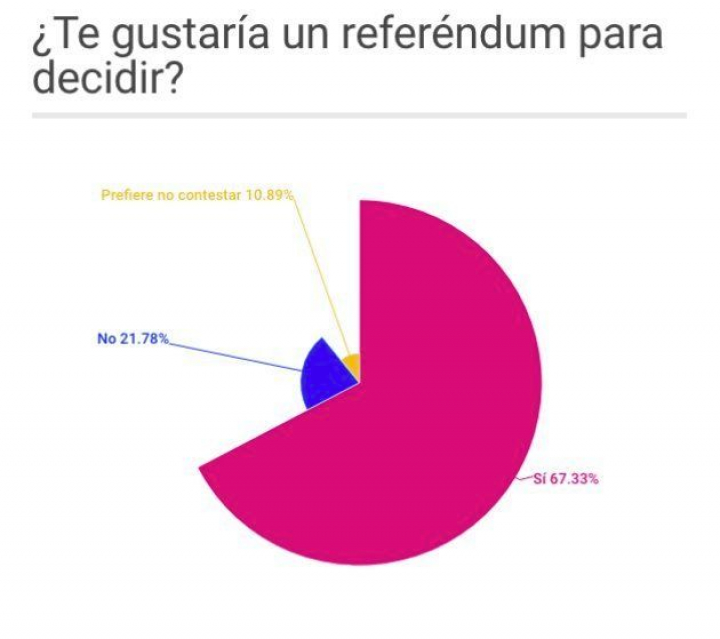 La segunda pregunta de la encuesta refleja que la mayoría de españoles que desea un referéndum para decidir sobre la forma del Estado es todavía más amplia que la que apoya la opción republicana. A un 68% de los encuestados le gustaría que hubiese una consulta de este tipo, frente al 22% que apuesta por el no.