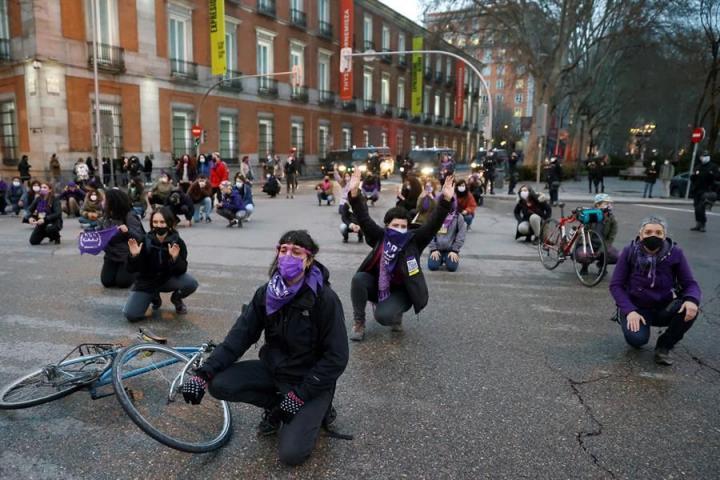 A pesar de eso, en Madrid no estaban previstas las concentraciones debido a que la Delegación del Gobierno prohibió todos los actos en la calle por motivos de “salud pública”, una decisión ratificada el fin de semana por el Tribunal Superior de Justicia de Madrid y que no ha revocado este lunes el Tribunal Constitucional. Por eso muchos grupos han decidido salir vestidas de morado a reivindicar, empapelar Madrid con carteles o hacer otro tipo de acciones y homenajes.