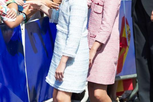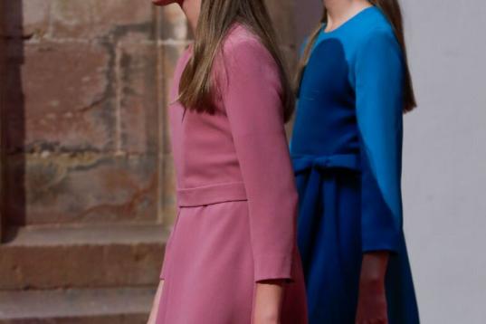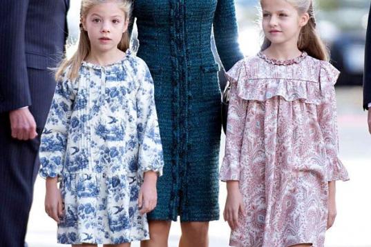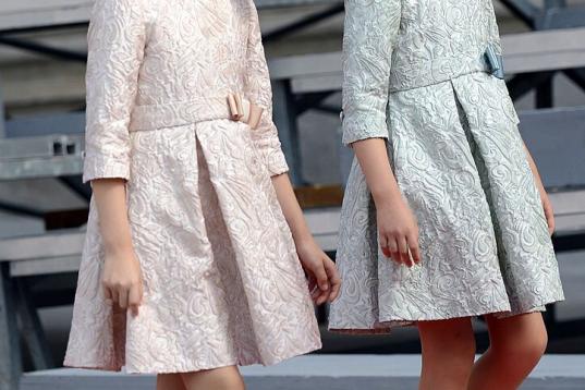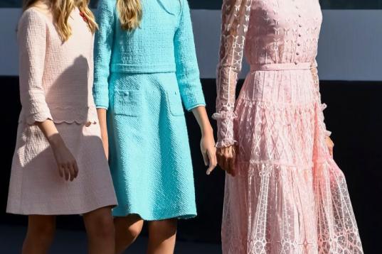 La princesa de Asturias y la infanta Leonor han lucido dos vestidos cortos, por encima de la rodilla, acorde total con el protocolo que dicta vestido por la rodilla por la mañana, apunta Rubio. En el caso de Leonor, con marga murciélago y adornado con botones dorados a los lados. En el de Sofía, con manga abullonada, cinturón y cuello cerrado.