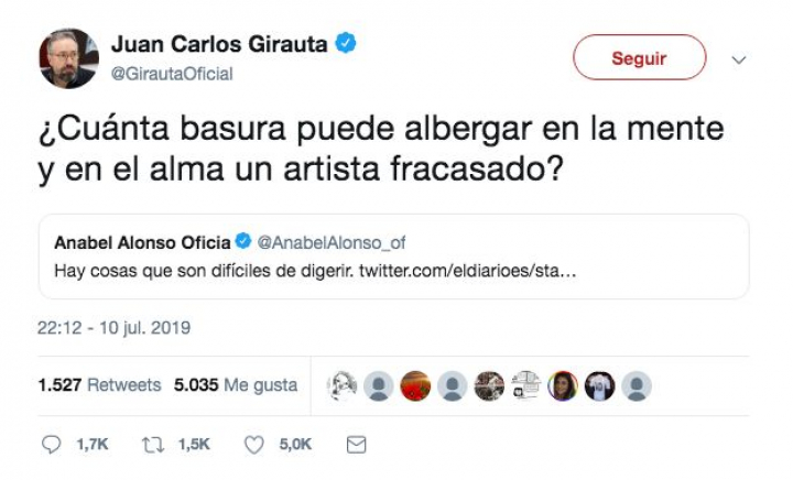 Entre las respuestas recibidas por Alonso, la del diputado Juan Carlos Girauta, quien ha tildado de “fracasada” a la actriz.