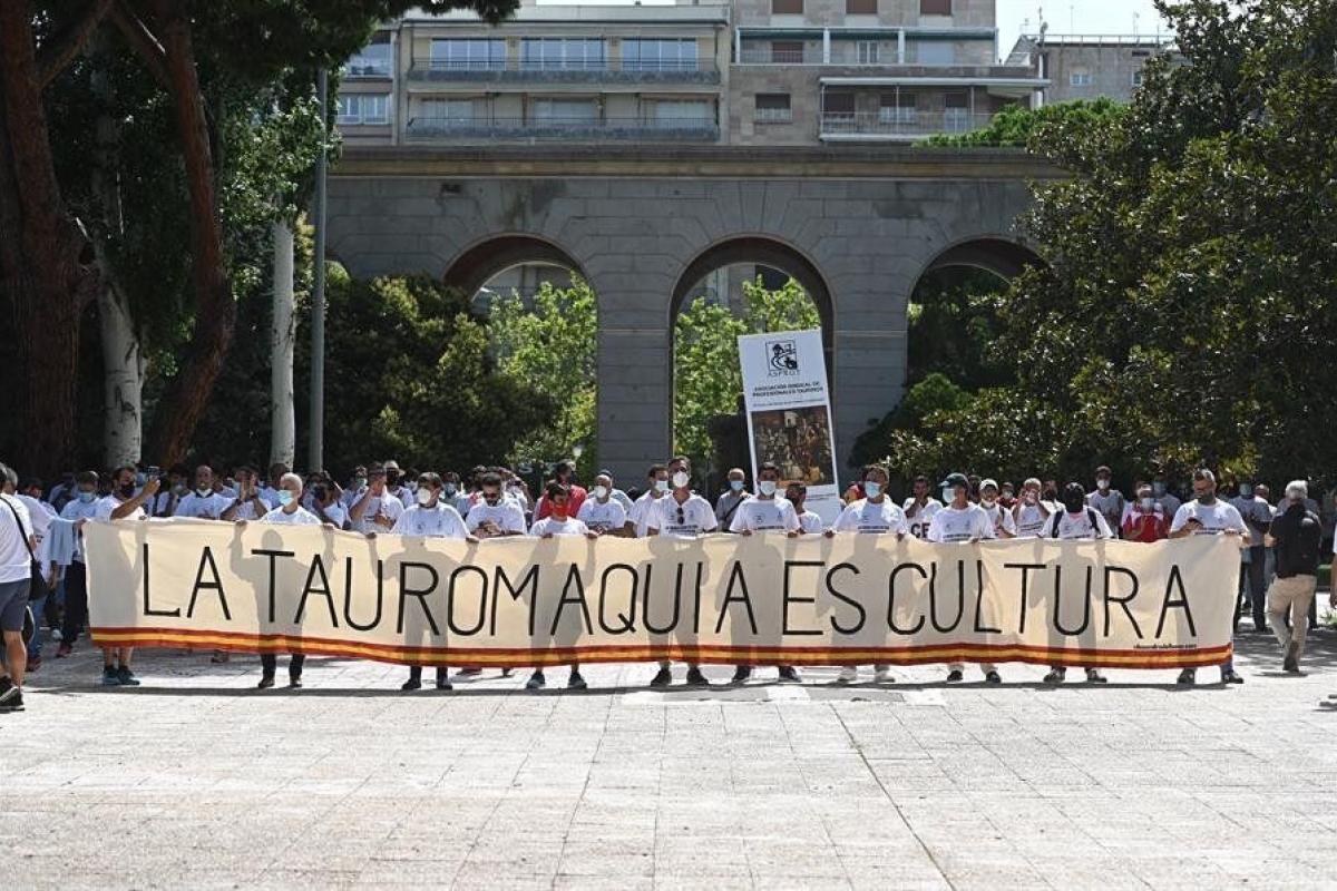 La concentración estaba precedida por varias pancartas en las que se afirmaba “Los toreros somos cultura, no a la discriminación”, “La discriminación es delito, la tauromaquia es cultura” o “La cultura no se censura, señora ministra no discrimine a los toreros”.