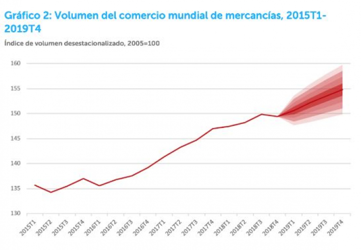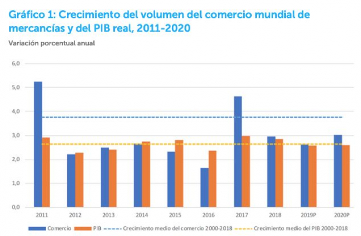 Durante 2018 el comercio mundial creció a ritmos del 3,0%, según el informe de la OMC. Para el 2019, se espera que, tras las continuas tensiones comerciales y el escenario económico que presentan las principales economías desarrolladas, el comercio global descienda hasta el 2,6%, dejándose un 0,4% para este año. Sin embargo, desde el organismo advertían que, de relajarse las tensiones comerciales y lograr un acuerdo, el ritmo de crecimiento en el comercio podría experimentar un repunte que vuelva a situarlo en el 3,0%.