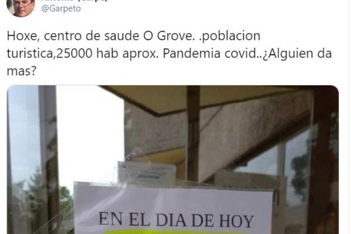 En las últimas horas se ha colgado un cartel en el ambulatorio del centro de salud de O Grove, un municipio de más de 10.000 habitantes situado en la provincia gallega de Pontevedra. “En el día de hoy solo hay un médico en el centro de salud. Solo se atenderán emergencias”, reza el cartel, que se ha viralizado por Twitter este jueves.