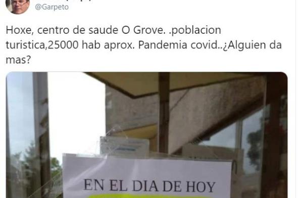 En las últimas horas se ha colgado un cartel en el ambulatorio del centro de salud de O Grove, un municipio de más de 10.000 habitantes situado en la provincia gallega de Pontevedra. “En el día de hoy solo hay un médico en el centro de salud. Solo se atenderán emergencias”, reza el cartel, que se ha viralizado por Twitter este jueves.