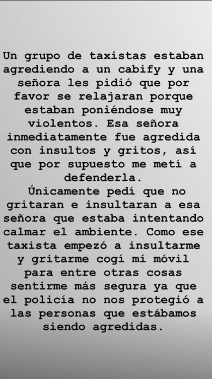 Y en un vídeo en su cuenta de Instagram lo explica todo: "Entonces me ha gritado a mí. Ha sido totalmente descortés, maleducado y agresivo. A mí no me insulte, ¿vale? No me insulte. Ni tonta, ni imbécil, ni idiota, ni nada, ¿vale? No vuelva a insultar, no haga eso, que hay muchos taxistas en esta vida que tienen mucha más educación. No me vuelva a insultar, que llamo a la policía. No me insulte. Yo no le he insultado en ningún momento, solo he dicho que no sea agresivo y que no grite a la señora, ¿vale?".