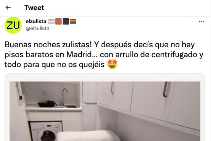 “Buenas noches zulistas! Y después decís que no hay pisos baratos en Madrid… con arrullo de centrifugado y todo para que no os quejéis”, ha escrito El Zulista junto a una foto del anuncio en cuestión