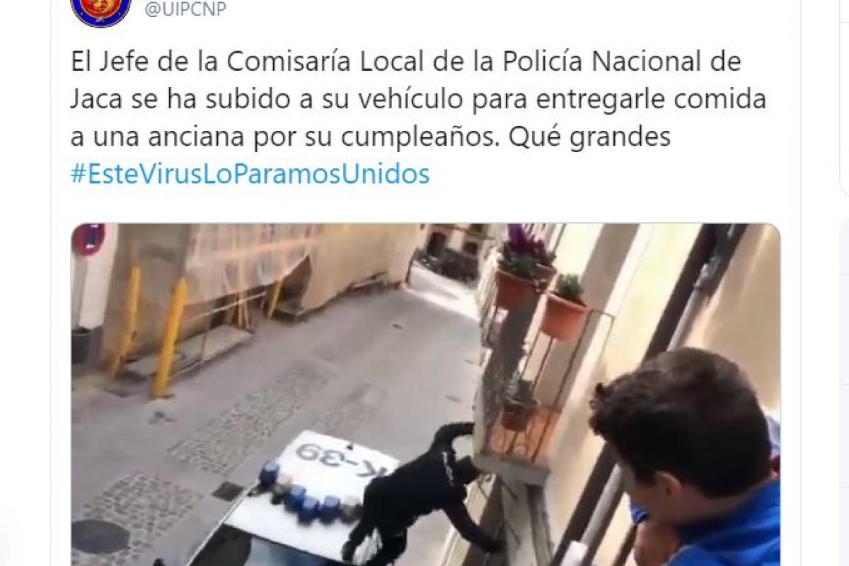 El Jefe de la Comisaría Local de la Policía Nacional de Jaca se ha subido a su vehículo para entregarle comida a una anciana por su cumpleaños. Qué grandes#EsteVirusLoParamosUnidos pic.twitter.com/igBJsR4lI3