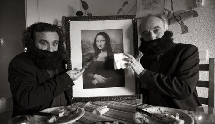 La performance está construida a partir de tres motivos icónicos. La primera imagen motriz de la obra es el famoso plátano de Maurizio Cattelan, el cual aparece en distintos momentos claves. Es quizá el símbolo más utilizado de los tres (aunque eché en falta que hubiera referencias a su obvia función cómica). El segundo motivo es una reproducción en fotocopia de la Gioconda. Tras la obvia referencia al Benjamin de la obra de arte en la era de su reproducción mecánica (por cierto, una obra tan antigua como La casa de Bernarda Alba—1936—y que se sigue citando como si fuera moderna), Los Torreznos efectúan una parodia de las casas de subastas y una reflexión sobre la proliferación de las interpretaciones del arte. Se reparten fotocopias de la obra: se subastan, se mutilan (como le pasó a la Mona lisa), se trituran (como el Girl with a Balloon de Banksy en Sotheby´s). El último motivo, quizá el más importante, es el del convivio. Los Torreznos nos invitan a degustar un vino, la esencia ético (y etílica) de la obra de arte es que se disfrute con el público.