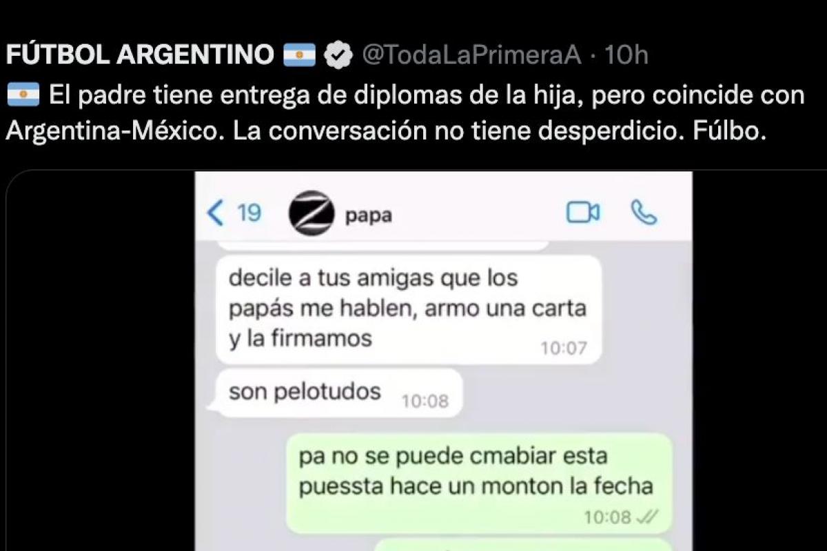 El usuario de Twitter @TodaLaPrimeraA, un aficionado que tiene su vida “dedicada al fútbol”, en concreto al argentino, ha publicado una divertida conversación de WhatsApp de un padre enfadado porque la entrega de diplomas de su hija coincide con el partido Argentina-México que tendrá lugar este sábado.