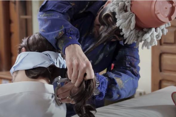 “No quiero la coleta en mi casa”, se escucha decir a Berta, mujer de Antonio Recio mientras este acaba con el característico rasgo del político mientras este aparece con los ojos vendados.