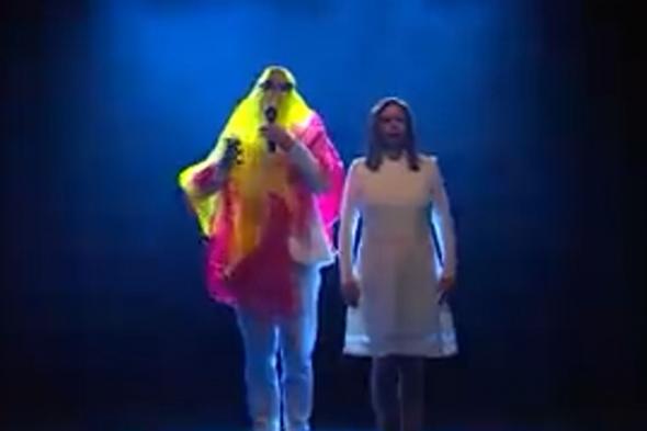 Además y para redondear la actuación, también se cambia el protagonista de ropa y en vez de sacar dos tetas gigantes, tal y como hizo Rigoberta Bandini en el Benidorm Fest, saca dos testículos gigantes.