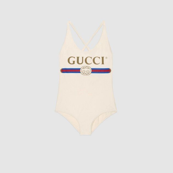 Es un traje de baño blanco, con un gran logotipo vintage de la marca en su parte central y fabricado en licra brillante de color marfil. Escote halter, cuello de cuchara y fabricado en Italia.