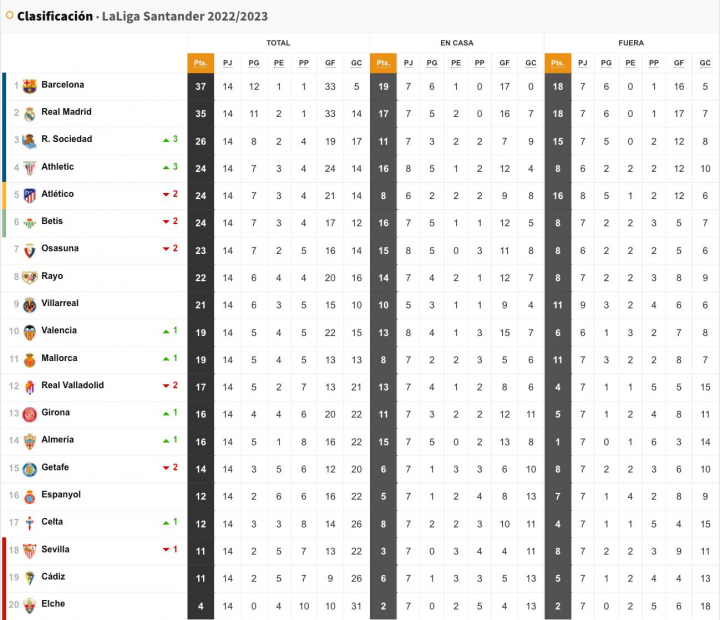 Pocos expertos podían imaginar un escenario similar en la jornada 14 de Primera División (oficialmente LaLiga Santander). El mismo Barça que quedó hundido en Champions y relegado a la Europa League se hace fuerte en casa. Tras alcanzar el liderato y perderlo en el ‘Clásico’ del pasado 16 de octubre, los de Xavi han vuelto a ponerse al frente de la clasificación aprovechando los despistes de un Madrid que se ha dejado muchos puntos en las últimas jornadas. Y todo en el contexto del adiós multitudinario y emotivo en el Camp Nou (previo a su expulsión sin jugar frente al Osasuna).