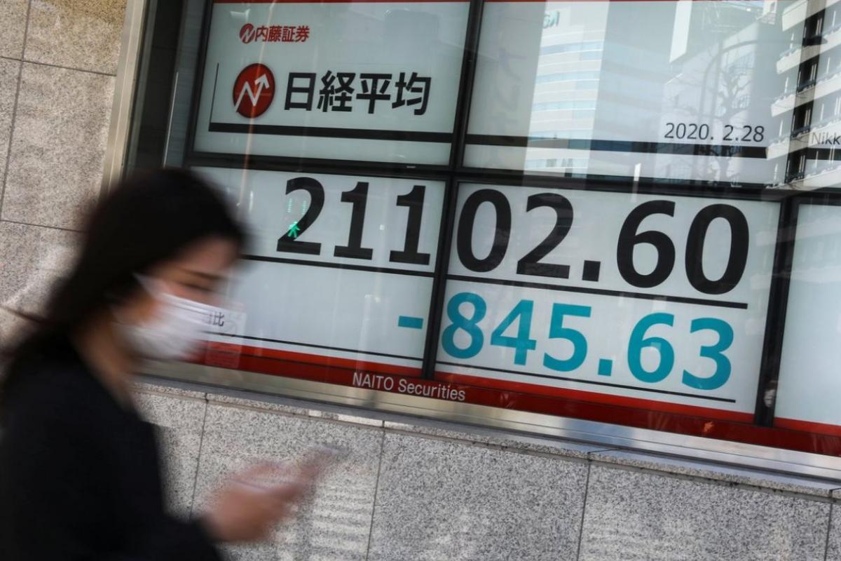 Una mujer con mascarilla protectora pasa frente a un cartel que muestra el índice Nikkei, en TokioREUTERS