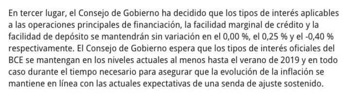 Los tipos de interés se mantendrán sin cambios "al menos hasta verano de 2019 y en cualquier caso tanto como sea necesario para asegurar que la evolución de la inflación continúa alineada con las expectativas de ajuste actuales".