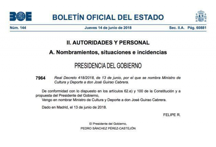 El BOE publica el cese de Màxim Huerta y el nombramiento de José Guirao como Ministro de Cultura y Deporte